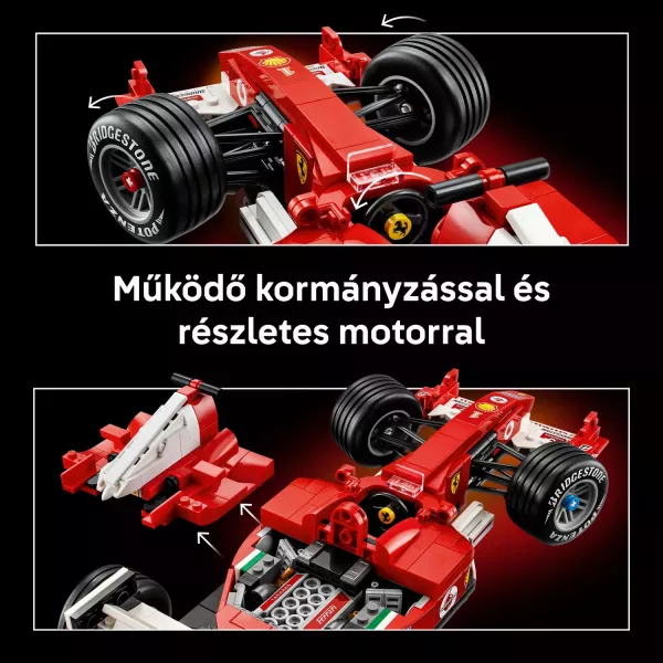 • ĪPAŠĪBAS UN FUNKCIJAS – LEGO® Ferrari F1 modelim ir darbināma stūre, detalizēta kabīne un V10 dzinējs, kā arī rievojošas šauras riepas ar uzrakstu Bridgestone Potenza