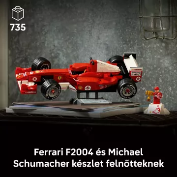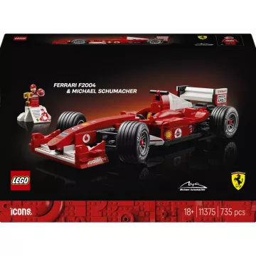 Sviniet Formula-1 zelta laikmetu ar LEGO® Icons Ferrari F2004 un Michael Schumacher (11375) modeļu automašīnu komplektu! Izveidojiet slavenā sacīkšu auto mēroga kopiju, ar kuru Michael Schumacher dominēja 2004. gada sacīkšu sezonā. Ferrari modelim ir darbināma stūre, rievojošas šauras riepas un detalizēts V10 dzinējs, kā arī prezentācijas statīvs, kurā uzrādīti transportlīdzekļa dati un statistika. Michael Schumacher figūriņai ir ķivere, uzvarētāja trofeja un pjedestāla stila prezentācijas statīvs, uz kura redzams septiņkārtējā pasaules čempiona attēls un citāts no viņa.